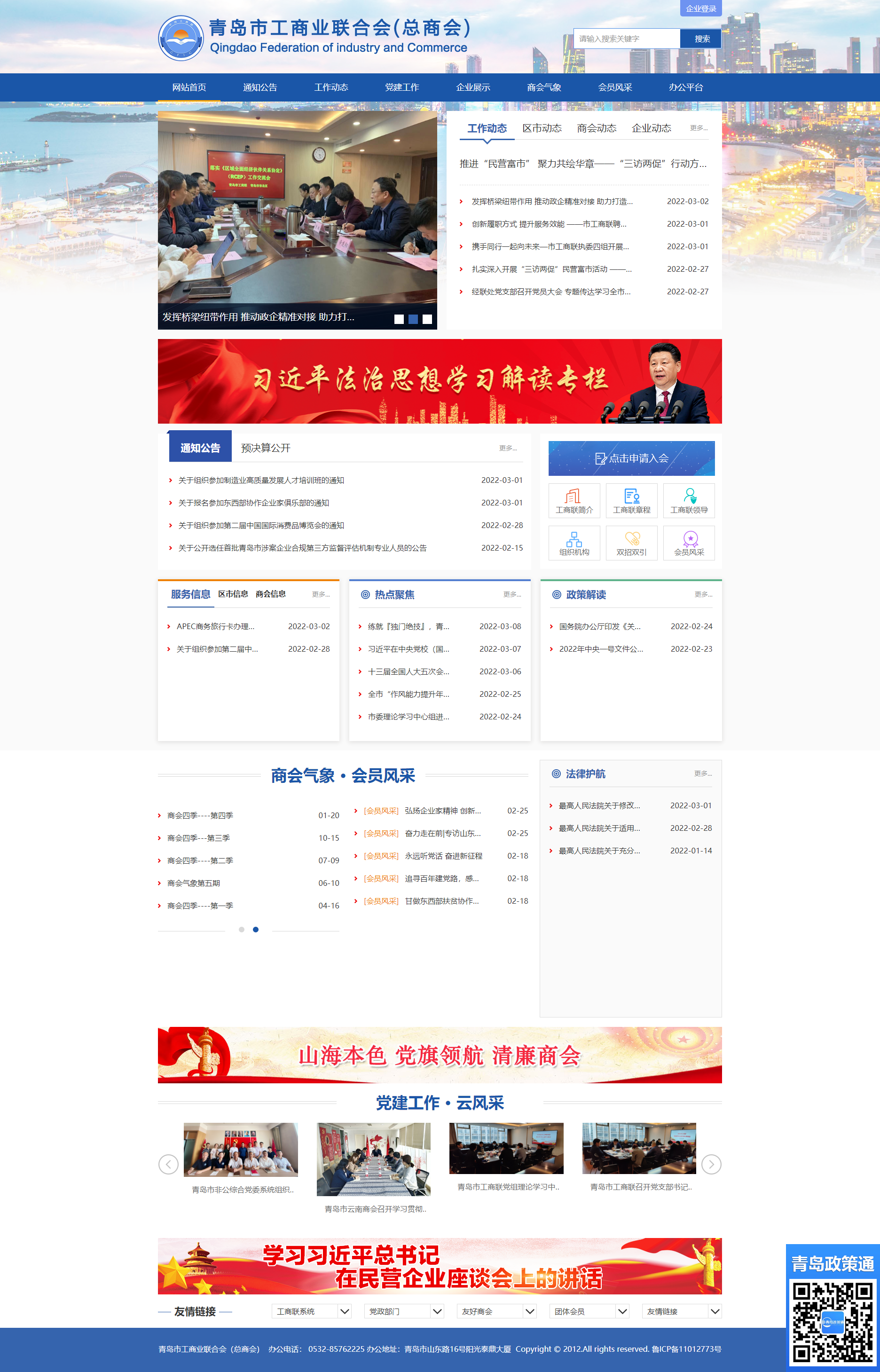 青岛市工商联成立于1952年6月,是中国共产党领导的青岛市工业界组成的人民团体和民间商会。是党和政府联系非公有制经济人士的桥梁和纽带,是政府管理非公有制经济的助手。全市建有12个区(市)工商联组织,170个乡镇(街道)商会;会员10318家;有装饰行业协会等团体会员92家和青岛市温州商会等12家直属商会。